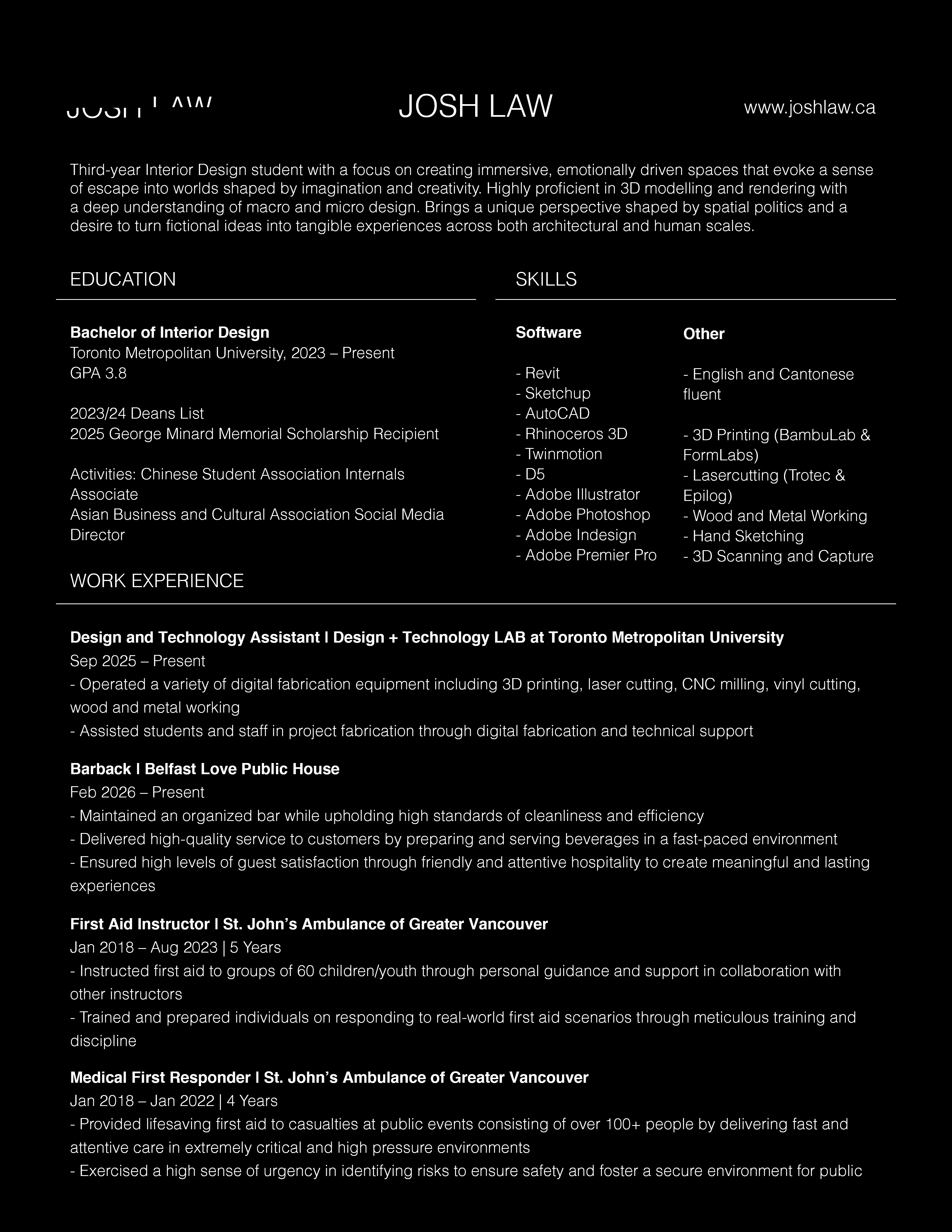 As a third year interior design student, Josh is Inspired by futuristic and visionary design through which he often incorporates technology and innovation to create potential future realities. By constantly exploring this line between real and unreal, Josh creates spaces that inspire and foster imagination in what the future could look like.